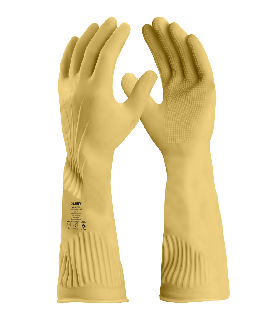 A Luva de Segurança Longatex da Danny, neste kit com 12 pares, é um equipamento de proteção individual (EPI) confeccionado em borracha natural (látex). Possui um acabamento interno flocado que proporciona maior conforto e facilita o calçar e tirar. Sua superfície antiderrapante na palma e ponta dos dedos garante excelente aderência em ambientes úmidos e secos. A espessura superior oferece alta resistência a rasgos e perfurações, enquanto o punho estendido, que pode ser dobrado, atua como coletor de respingos, protegendo o antebraço do usuário.